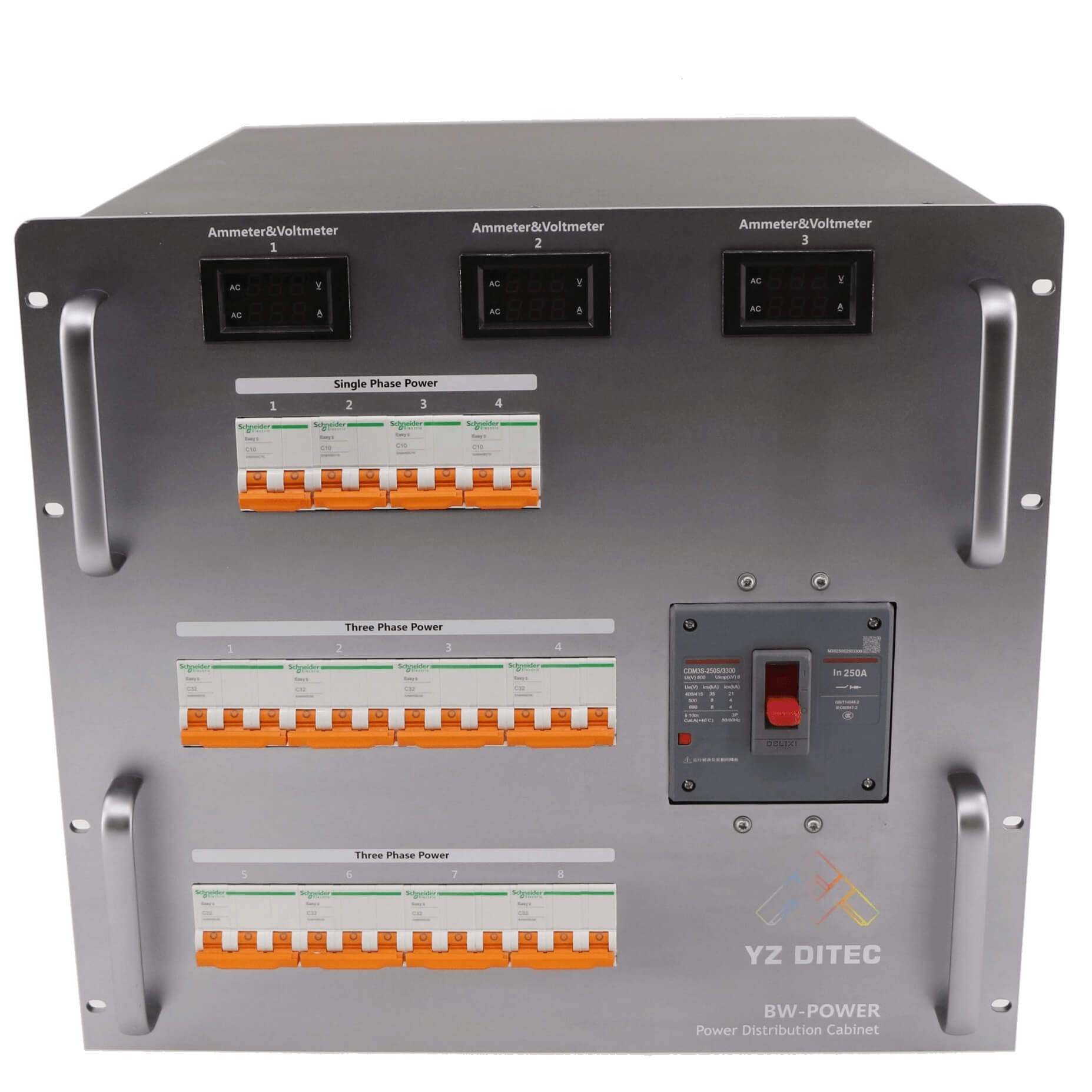 | Выходные цепи | • 4× 32А 3-фазные 380В (независимые выключатели) • 4× 10А однофазные 220В |